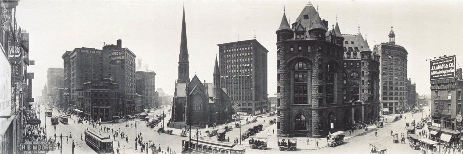 The largest office building in Buffalo, One Seneca Tower (formerly One HSBC Center), which is nearly entirely vacant, straddles Main Street, blocking the light, obliterating the horizon. The Convention Center wipes out a key segment of Joseph Ellicott’s brilliant radial street design: Genesee Street now ends at a door, disappears for three blocks, then resumes, a radial totally without function.