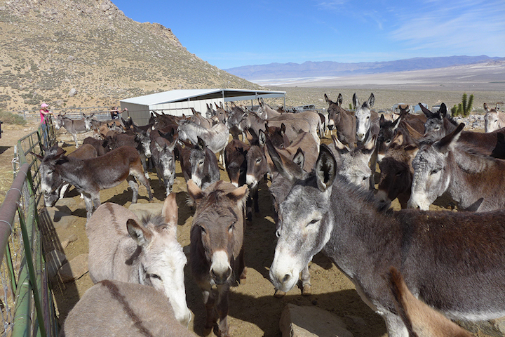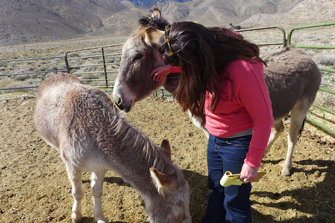 A long and dusty drive through the desert ended at the gates of Wild Burro Rescue and Preservation Project, founded by Diana Chontos in 1994. It’s a 130-acre sanctuary for 200 burros, a handful of horses and mules, a cow, and some dogs. Raised on a farm in the Northwest and a lifelong burro owner, Diana began doing rescue work when she heard that burros were being not only displaced but shot by Park Service and Bureau of Land Management despite a 1971 law passed by Congress mandating roaming land for them. In California cattle ranchers needing to lease more grazing land, and in other Western states those protecting bighorn sheep (also sometimes hunted by those with expensive, auctioned permits), has meant an unfortunate end for thousands of burros.