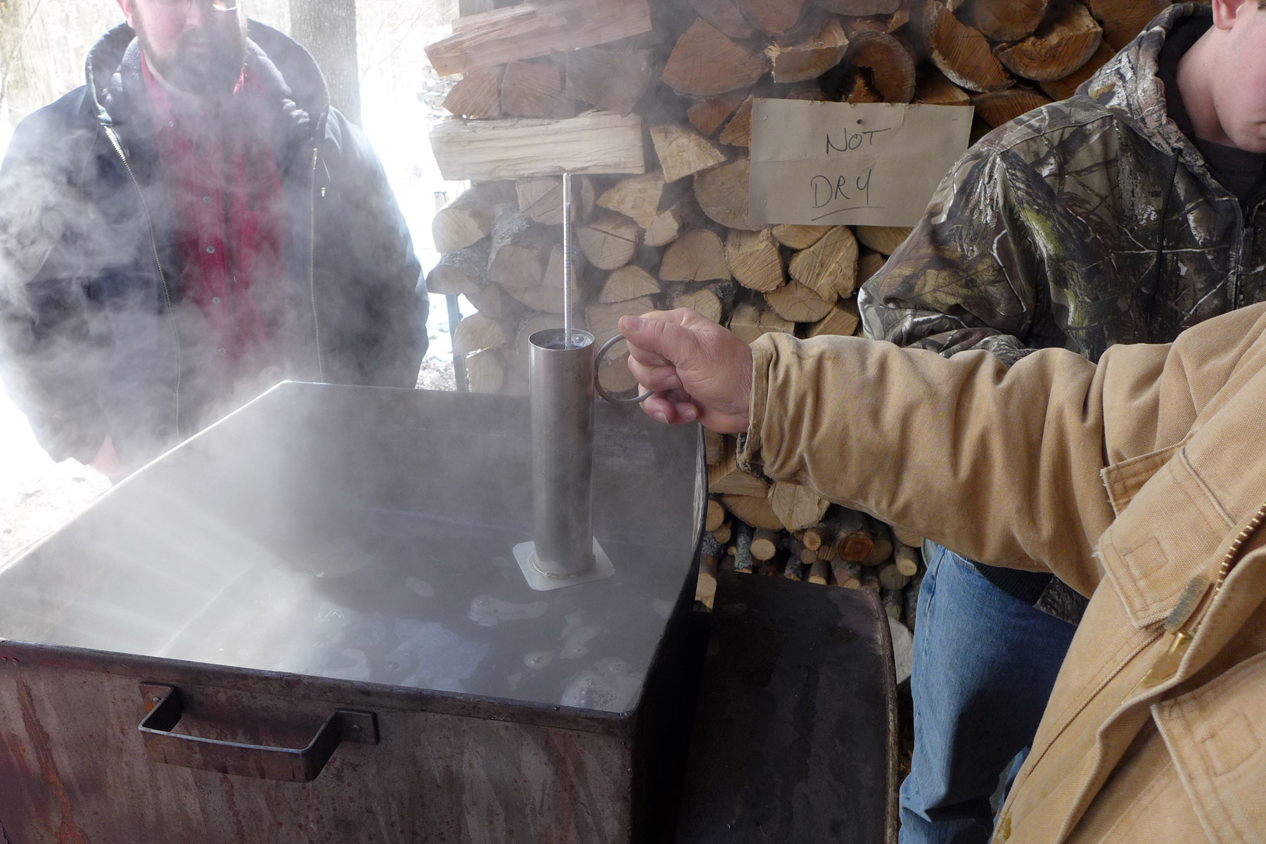 Here’s a CliffsNotes version/refresher for city folk: Spring temperatures mean, as with humans, that things are thawing and flowing again. The guts of the trees freeze in winter and thawing means that sap, the lifeblood of the trees, gets moving: tapping trees takes the subtly-sweet sap from the tree and into collecting containers. The simple act of slow-rolling boiling yields maple syrup: 40 gallons of maple sap equals one gallon of maple syrup and those manning the fires may tell you how Native Americans miraculously discovered how to make syrup from “sweet water.”