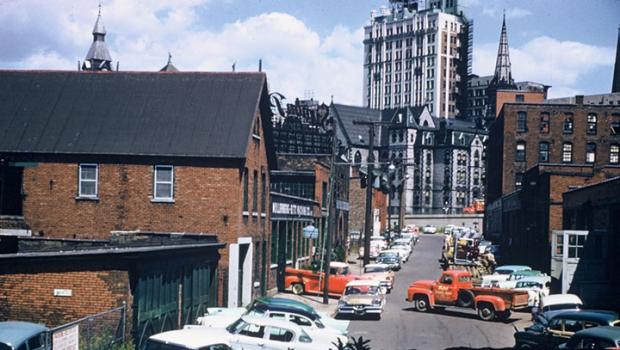 Henry Street no longer exists. As with several others, Henry Street was wiped off the map by the Waterfront Urban Renewal Project in 1963. Seen here in 1958, Henry Street was one of the rights-of-way that led from the Terrace to the Erie Canal. In the distance are St. Joseph’s Cathedral & Rectory and the elevated approach to the Buffalo Skyway, completed a few years earlier in 1955. The back of a Simon Pure beer billboard is visible in the center. The nearby Jackson Street, Bingham Street, Marshall Alley, Kelderhouse Alley, Mechanic Street, Birsdall Street, Stevens Street, and Ann Street and are all gone, too. Horizons Plaza, home to WNED and WBFO studios, occupies the site of Henry Street today.
