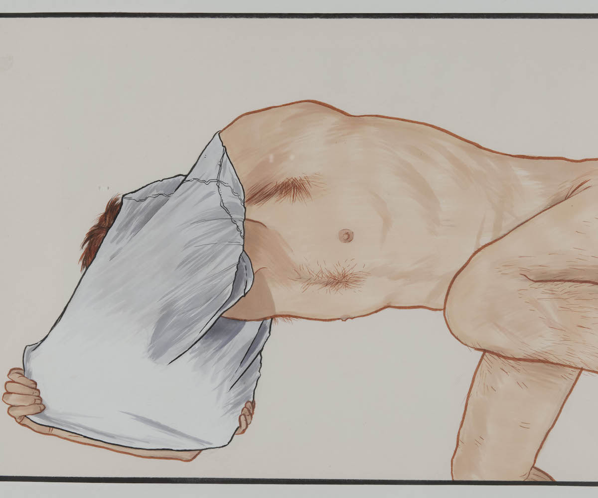 A few images that Tyrrell has sent out for the show, show a focus on the body. Cristiano Pereira’s photograph, Selfie Steam 1, is exactly as stated—a portrait of himself through a fogged-up mirror, his body obscured so heavily by the steam one can barely perceive anything beyond the tone of the body and its flat background. Naked, yet hidden. In Adam Weekley’s Untitled, is a gouache painting of a male body, sitting semi-naked, the figure is taking off his white t-shirt. The viewer sees his knees, chest, lower hip, and the top part of his head hair sticking out from the shirt. These works both give the viewer little information about the subject of the work. Both pieces highlight bodies but make the viewer make up their own narrative about the work. These are just two pieces selected by Tyrrell that embody his vision for bringing these pieces all together for Contemporary Queer.