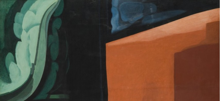 Among the items on show, flattening effects—and basic-stage abstraction—most prominent in works by Charles Sheeler and Stuart Davis. Davis’s handsome little harbor scene with vaguely personified small craft fishing boat looking eager to get out on open water and at the day’s labors. Or a simplified formalist commercial-industrial cityscape. Sheeler’s monotone blocks of pure geometrical forms architectural scenario, featuring monumental silo forms reminiscent of Buffalo waterfront grain silos. Or more-advanced-stage abstraction in a brickwork and rooflines depiction with prominent cubist inspiration fragmentation effects.