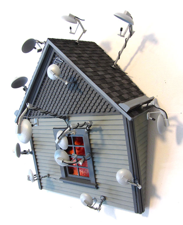 The show centerpiece—a large free-standing floor work—is called Tunguska Minor, in reference to a mysterious possibly astronomical event in the early twentieth century in Siberia that left what the artist calls “an apocalyptic wasteland” thousands of square miles in area. The focal aspect of the piece is approached via several steps up, then rather hard-to-negotiate rampway down—Sczerbaniewicz likes to put his audience through some physical exertions in accessing his work, maybe on the idea that pain equals gain, but at least to make it a bit of a visceral experience—whereupon you peer into a sort of diorama viewing channel at a domestic interior space crash-destroyed by some unknown cataclysmic occurrence. What was a living room floor now a huge open hole, looking into another infernal scene below. And broken frame and shattered glass picture of George W. Bush hanging askew on one of the still intact walls.