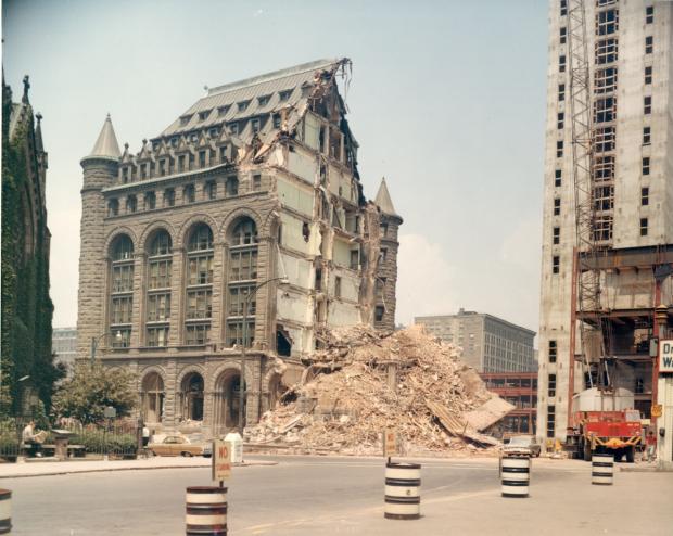 The Erie County Savings Bank was perhaps Buffalo’s most beloved building. Built from 1890 to 1893 and designed in the Romanesque Revival style by acclaimed architect George B. Post, the nine-story building was often referred to simply as “The Castle.” In this 1967 photograph, the 74-year-old building is chipped away by the wrecking ball. The elevator shaft of the Main Place Tower, to be the bank’s new headquarters, is under construction to its north. Harlan J. Swift, Erie County Savings Bank president, made the decision to demolish the old landmark. The bank went out of business in 1990.