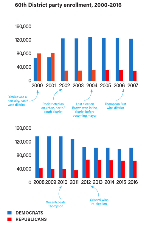 When most politicos talk about the shift of the district from a Democratic stronghold to the frenetic and unpredictable scenarios that have played out in recent elections, they point to the most recent round of redistricting. The redrawn lines cut the registration advantage for Democrats over Republicans from almost 5-to-1 to less than 2-to-1.