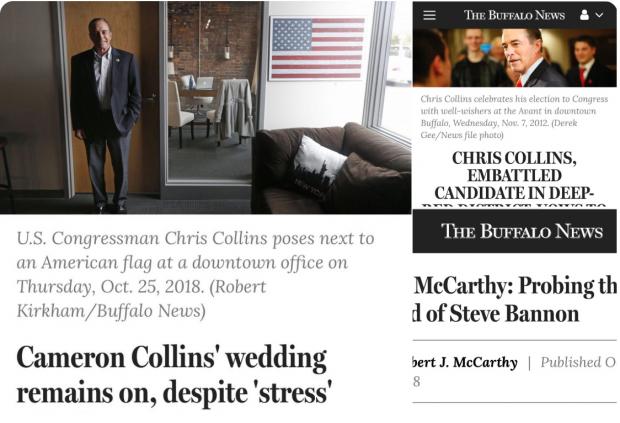 Let’s deal first with the insane Cameron Collins wedding article. It’s not newsworthy. In the wake of the mass murder of Pittsburgh synagogue congregants and the attempted bombing assassinations of prominent Democratic Trump critics, no one really gives a shit from a rat’s ass about the lifestyles of the rich and famous and how “[t]he congressman said last week that his son’s wedding to fiancée Lauren Zarsky remains on despite the charges surrounding the two families. ‘They’re two peas in a pod,’ he said.”