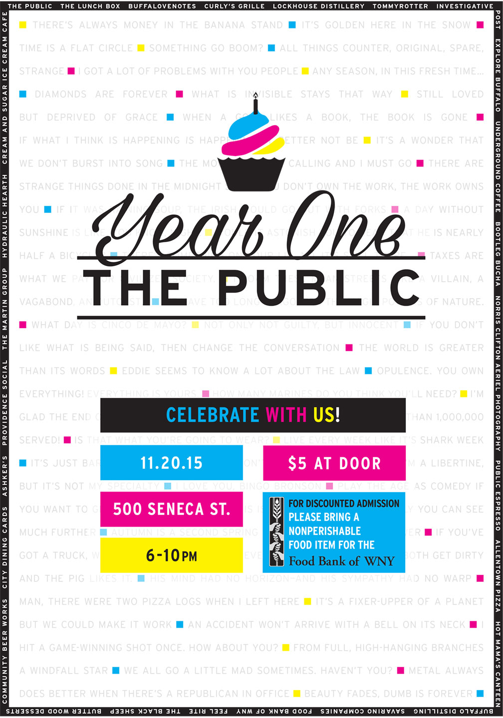 [CELEBRATION] Only a year ago our staff of seven was crammed into its first office: a windowless bunker on the fourth floor of John McKendry’s Hi-Temp Fabrications in the Cobblestone District. The unheated room was filled with ephemera from Harley Spiller, the famed collector of Chinese menus, among other things, and it took some trials-by-error to figure out which space heater could be plugged in to which outlet without catastrophically shutting down our computers and server. A year later, we’re excited about our direction and about the future of alternative media in Buffalo. Nearly 200 writers, artists, and illustrators have contributed to our publication. We made an editorial partnership with City & State early this year, and we couldn’t be more proud to be Investigative Post’s print partner. There’s a lot to celebrate. This Friday, November 20 in the third-floor atrium of 500 Seneca, The Public will host its First Birthday Party. There will be food (Allentown Pizza, Curly’s Grille, Feel Rite, the Black Sheep, Hot Mama’s Canteen, Ashker’s, Providence Social, the Lunch Box, Butterwood Deserts, Hydraulic Hearth, Cream & Sugar, Breadhive), drink (Lockhouse, Tommyrotter, Buffalo Distilling, Public Espresso, Undergrounds Coffee, Bootleg Bucha, Community Beer Works), informational tables (Explore Buffalo, Investigative Post, BuffaloveNotes, Savarino Companies, Food Bank of WNY, City Dining Cards, the Martin Group), art (Norris Clifton Aerial Photography), and music (DJ Dovey and Steve Balesteri). Bring some canned goods for the Food Bank and we’ll knock $2 off your admission. When the happy hour’s over, check the map on page 22 for other spots to visit in and around Larkinville, including the official after-party at Hydraulic Hearth, where we held our launch party back in December. Don’t forget to RSVP!